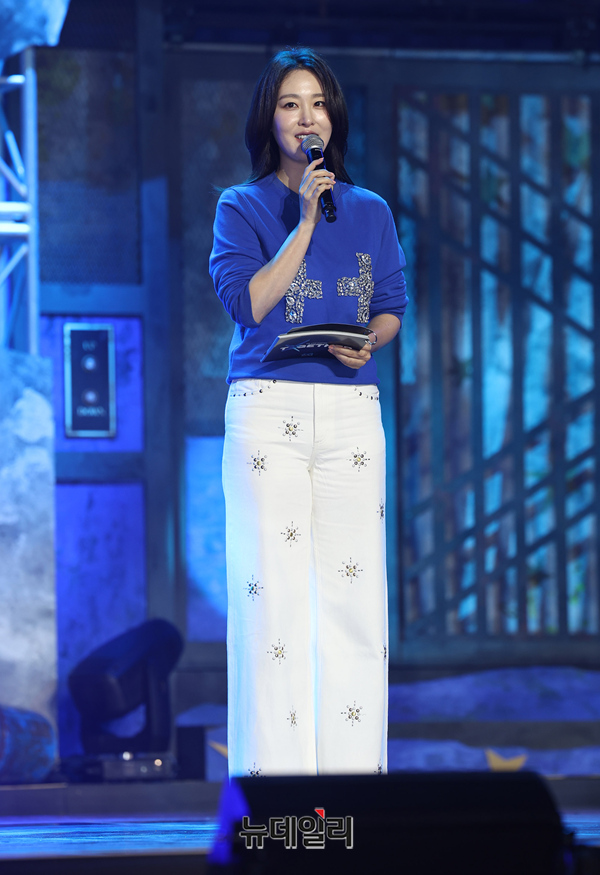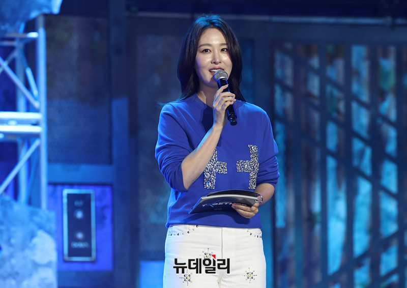 신아영 아나운서가 21일 오후 서울 동대문구 경희대 평화의전당에서 열린 투모로우바이투게더(TXT) 정규 4집 '별의 장 : TOGETER' 발매 기념 쇼케이스에서 멤버를 소개하고 있다.