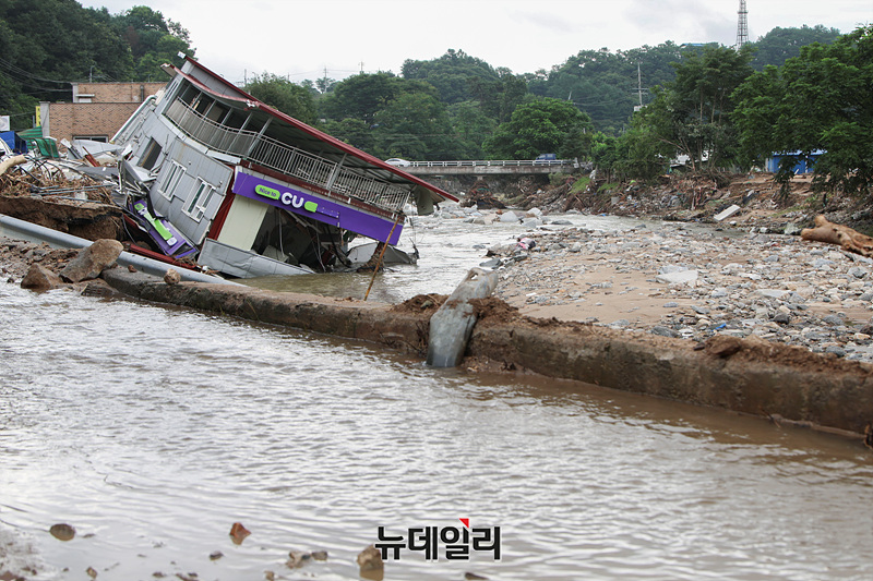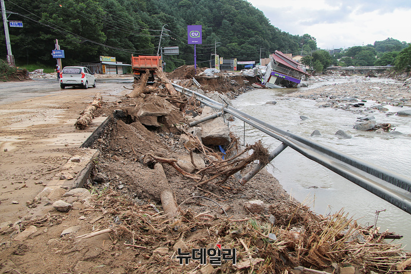 경기 가평군 일대가 집중호우로 대규모 피해를 입은 가운데 22일 오전 조종면 십이탄천 인근에 위치한 편의점 건물과 인근 도로가 무너져 있다. (경기 가평=서성진 기자)