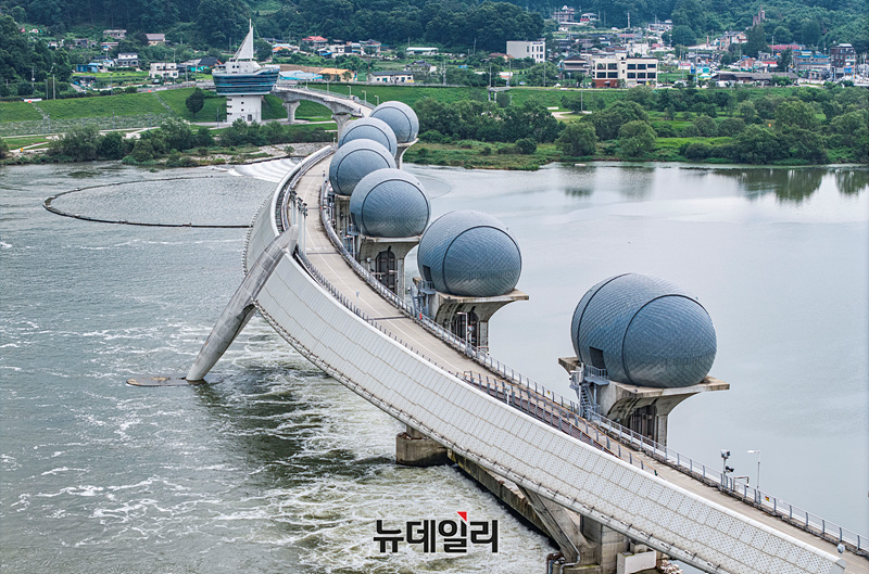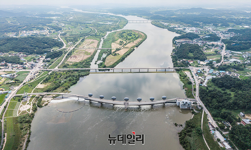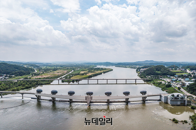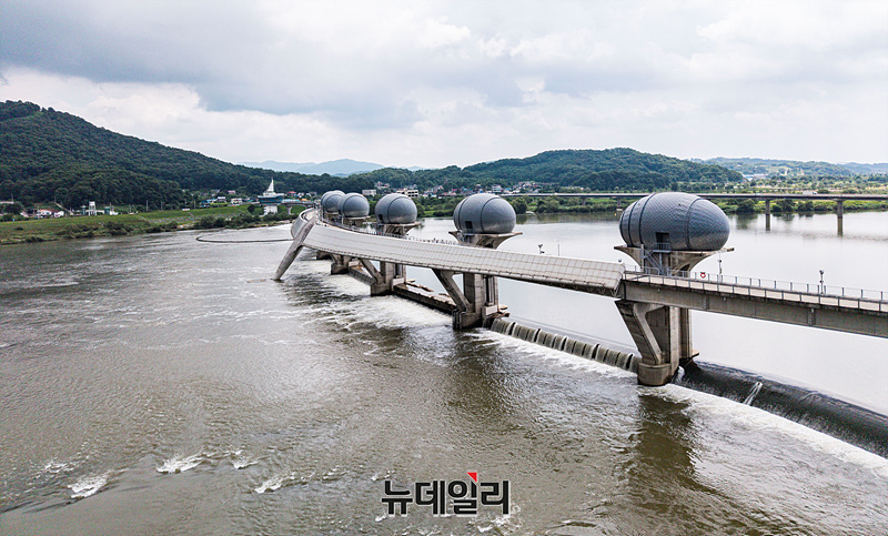 4대강 사업으로 건설된 경기 여주 이포보가 22일 오전 물을 흘려 보내고 있다. (경기 여주=서성진 기자)