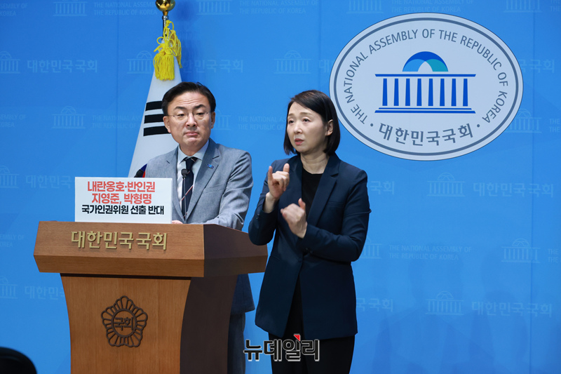 신장식 조국혁신당 의원이 23일 오전 국회 소통관에서 국민의힘이 추천한 지영준·박형명 국가인권위원 선출 반대 기자회견을 하고 있다