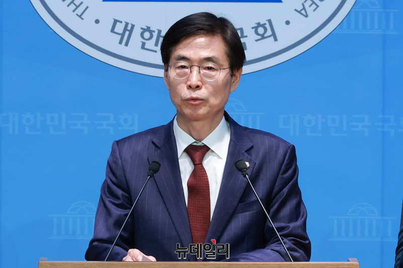 국민의힘 당대표 출마를 선언한 조경태 의원이 23일 오전 국회 소통관에서 '혁신후보 단일화를 위한 후보자 중심 대혁신회의 구성 제안 기자회견'을 하고 있다.