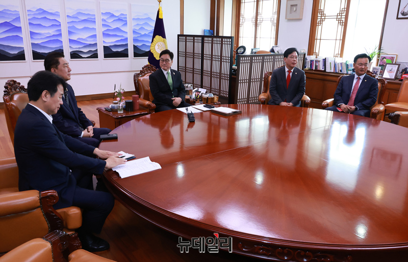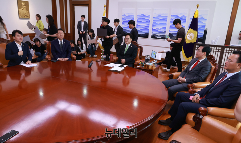 우원식 국회의장과 김병기 더불어민주당 대표 직무대행 겸 원내대표, 송언석 국민의힘 비상대책위원장 겸 원내대표가 23일 국회에서 열린 국회의장 주재 여야 원내대표 회동을 갖고 있다.