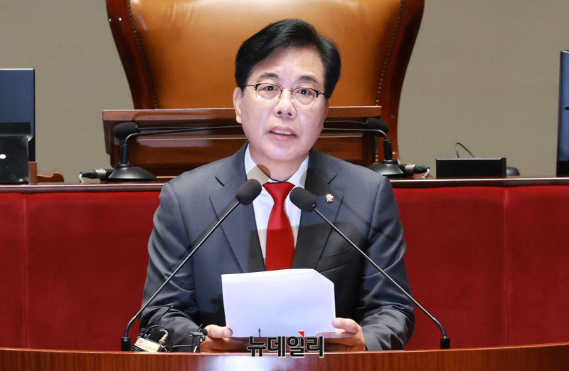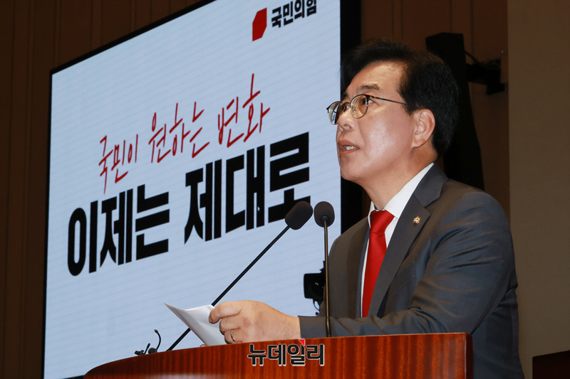 송언석 국민의힘 비상대책위원장 겸 원내대표가 23일 오전 국회에서 열린 의원총회에서 모두발언을 하고 있다.