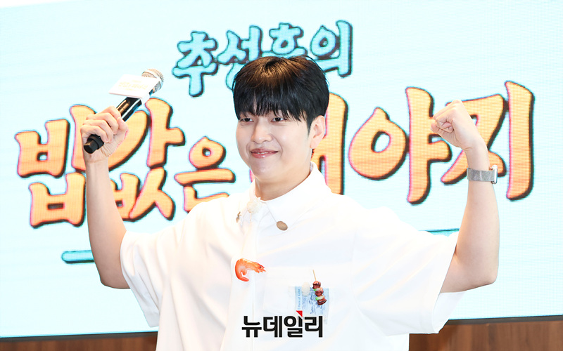 MC 유재필이 23일 서울 여의도 TWO IFC에서 열린 ENA, EBS 공동제작 예능 '추성훈의 밥값은 해야지' 제작발표회에서 포즈를 취하고 있다.