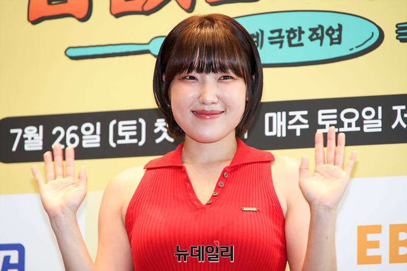 코미디언 이은지가 23일 서울 여의도 TWO IFC에서 열린 ENA, EBS 공동제작 예능 '추성훈의 밥값은 해야지' 제작발표회에서 포즈를 취하고 있다.