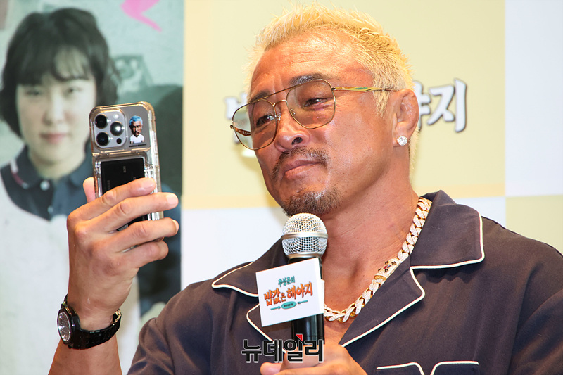 격투기 선수 추성훈이 23일 오전 서울 여의도 TWO IFC에서 열린 ENA, EBS 공동제작 예능 '추성훈의 밥값은 해야지' 제작발표회에서 휴대폰으로 영상을 촬영하고 있다.