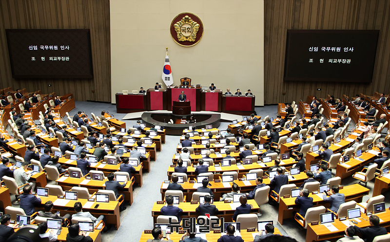 조현 외교부 장관이 23일 오후 국회에서 열린 본회의에서 신임 국무위원 인사를 하고 있다.
