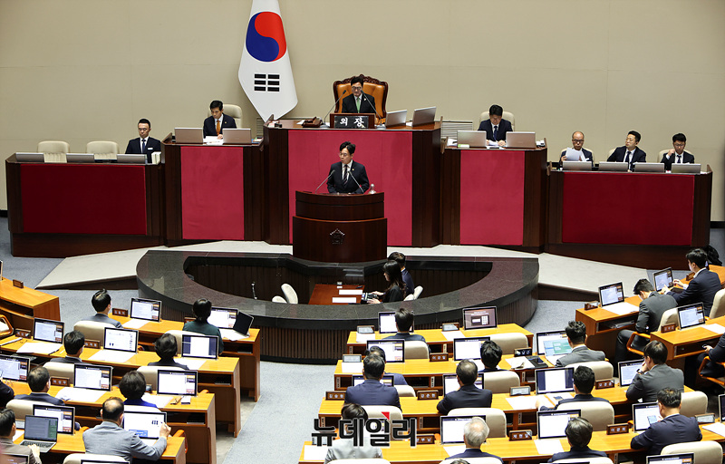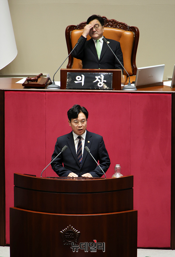 김영훈 고용노동부 장관이 23일 오후 국회에서 열린 본회의에서 신임 국무위원 인사를 하고 있다.