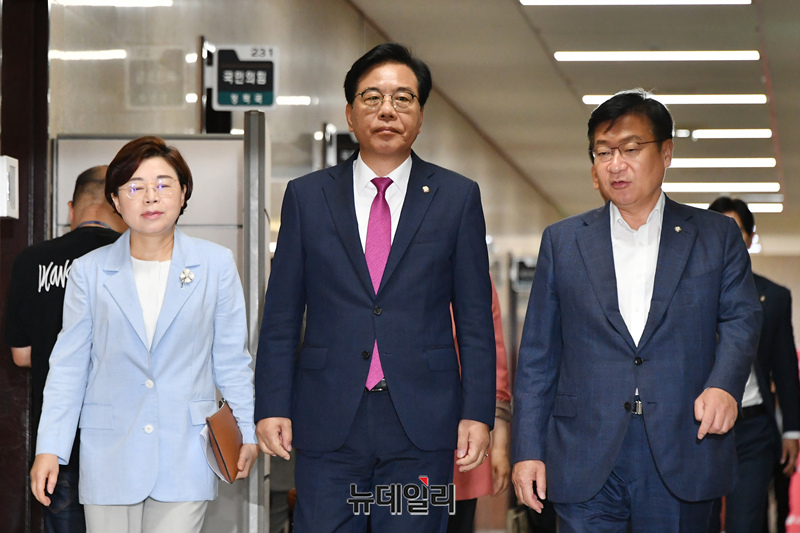 송언석 국민의힘 비상대책위원장 겸 원내대표 및 지도부가 24일 오전 국회에서 열린 비상대책위원회의에 참석하고 있다.