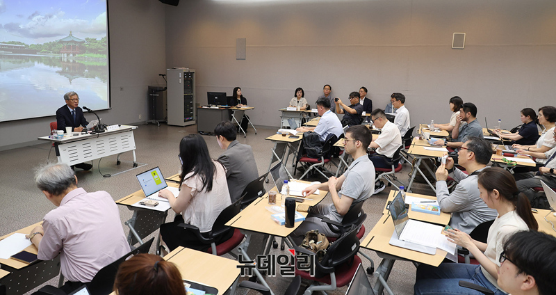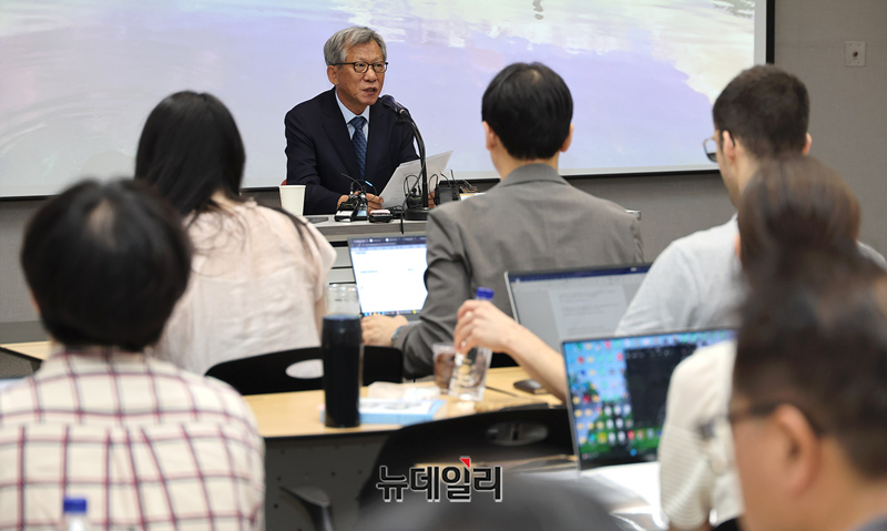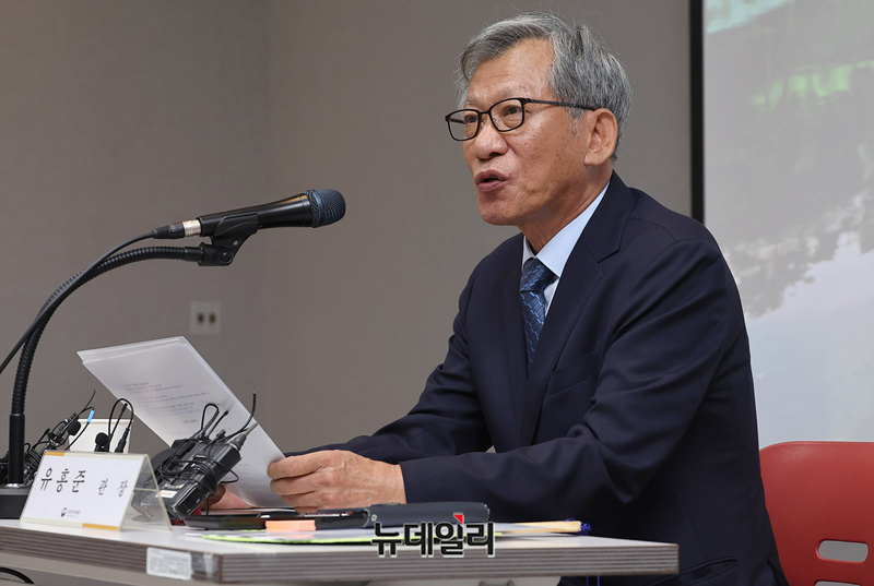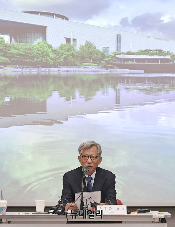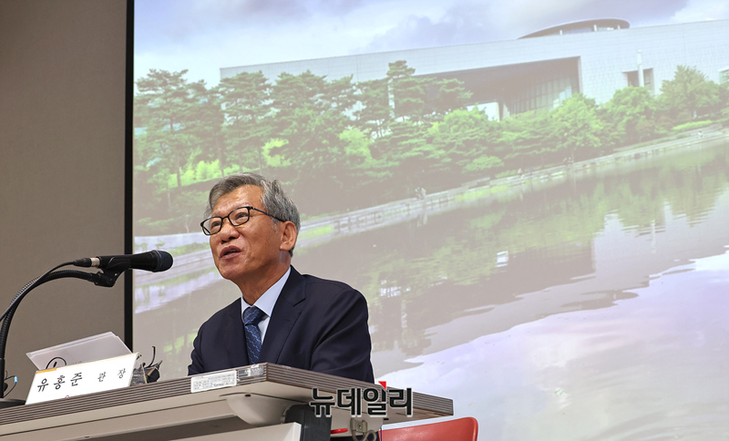 유홍준 신임 국립중앙박물관장이 24일 서울 용산구 국립중앙박물관에서 열린 기자간담회에서 박물관 비전을 발표하고 있다. 유 관장은 21일 취임식을 갖고 공식 업무를 시작했다.