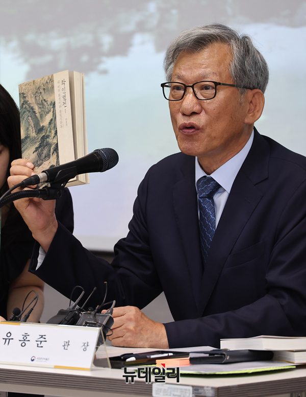 유홍준 신임 국립중앙박물관장이 24일 서울 용산구 국립중앙박물관에서 열린 기자간담회에서 저서를 소개하고 있다. 유 관장은 21일 취임식을 갖고 공식 업무를 시작했다.