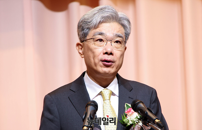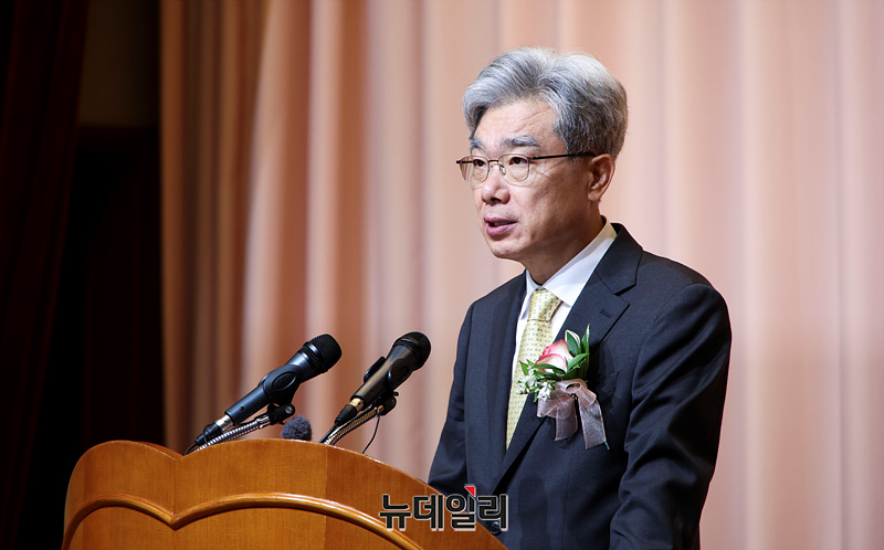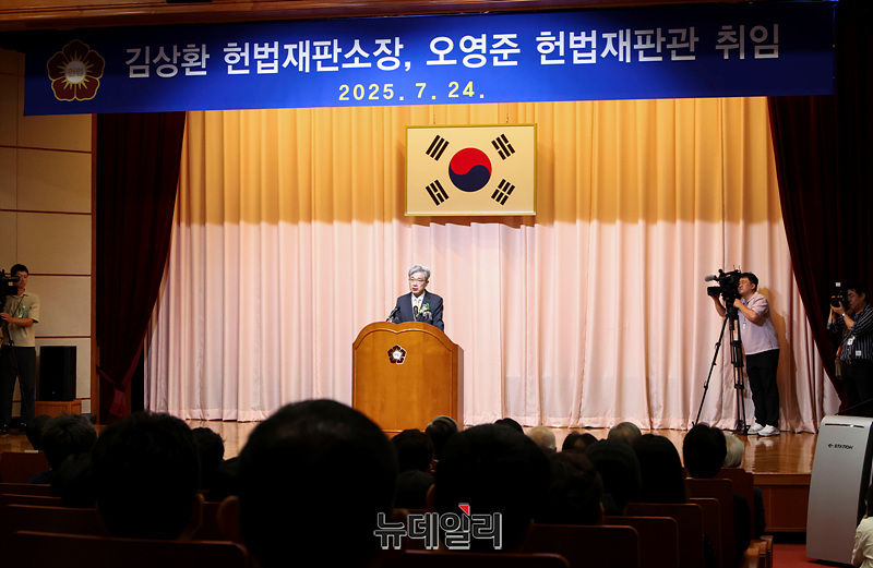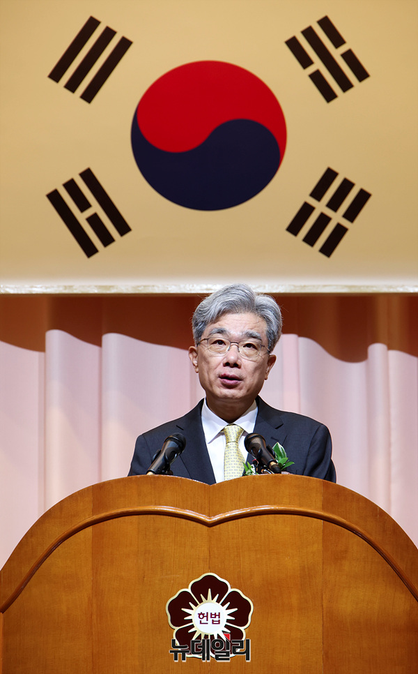 김상환 신임 헌법재판소장이 24일 오전 서울 종로구 헌법재판소에서 열린 취임식에서 취임사를 하고 있다.