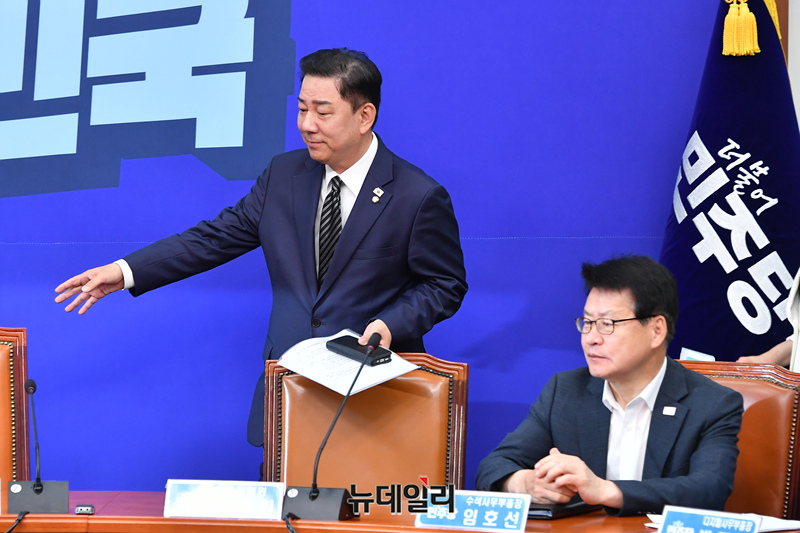김병기 더불어민주당 당대표 직무대행 겸 원내대표 및 지도부가 25일 오전 국회에서 열린 최고위원회의에 참석하기 위해 입장하고 있다.