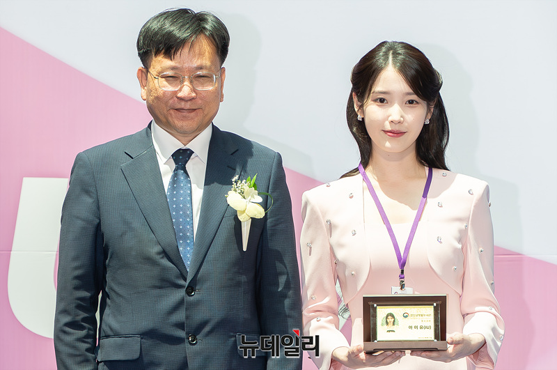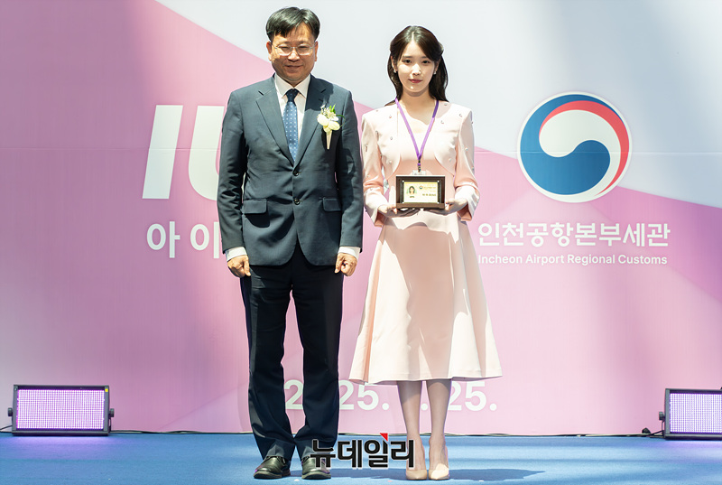 김종호 인천본부세관장과 가수 겸 배우 아이유가 25일 오후 인천국제공항 제1여객터미널에서 열린 인천공항세관 홍보대사 위촉식에서 기념촬영을 하고 있다. (인천=서성진 기자)