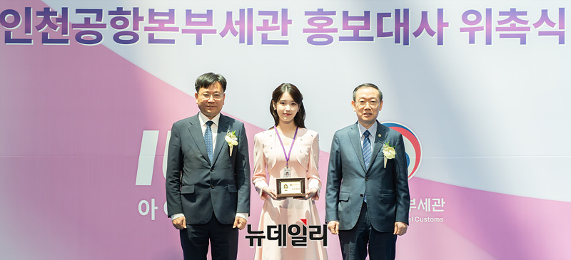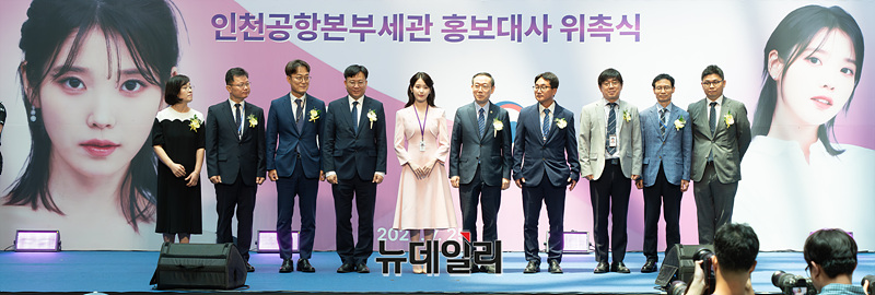 이명구 관세청장, 김종호 인천본부세관장, 가수 겸 배우 아이유를 비롯한 참석자들이 25일 오후 인천국제공항 제1여객터미널에서 열린 인천공항세관 홍보대사 위촉식에서 기념촬영을 하고 있다. (인천=서성진 기자)