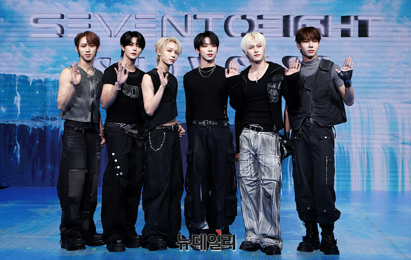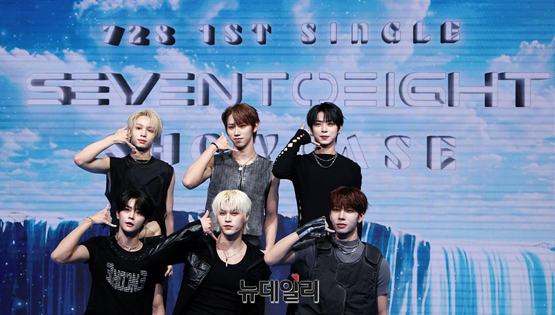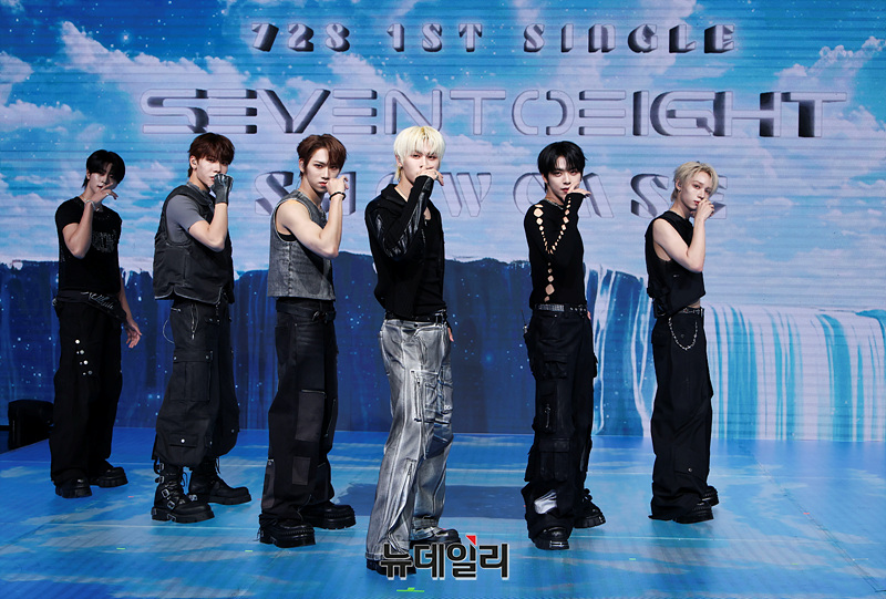 그룹 세븐투에잇(SEVENTOEIGHT) 치원, 디옴, 엠, 쿄준, 재거, 엑시가 28일 오후 서울 마포구 쇼킹케이팝센터에서 열린 데뷔 쇼케이스에서 포즈를 취하고 있다.