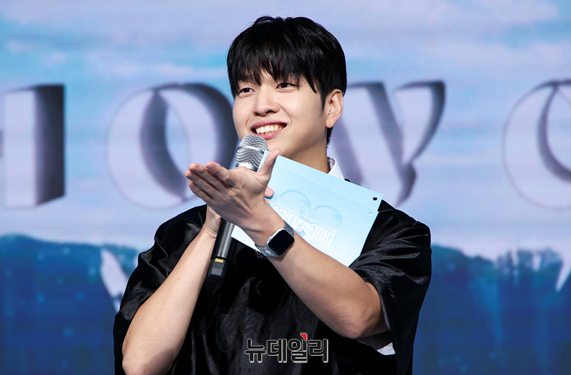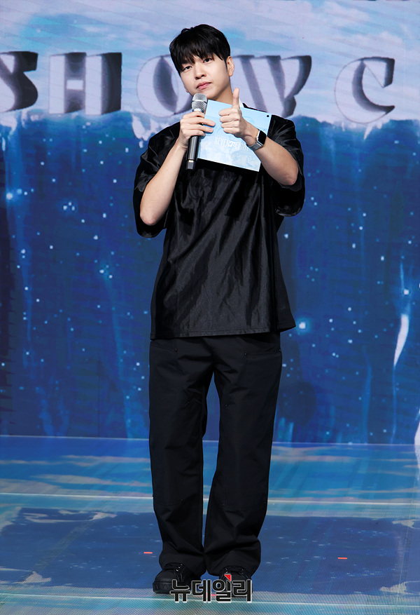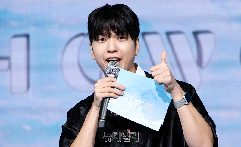 개그맨 유재필이 28일 오후 서울 마포구 쇼킹케이팝센터에서 열린 그룹 세븐투에잇 데뷔 쇼케이스에서 포즈를 취하고 있다.