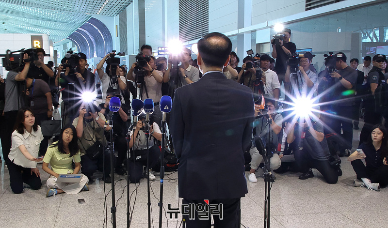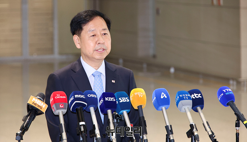 구윤철 부총리 겸 기획재정부 장관이 29일 인천국제공항 제2여객터미널에서 스콧 베선트 미국 재무장관 면담을 위해 워싱턴DC로 출국하며 인터뷰를 하고 있다. (인천=서성진 기자)