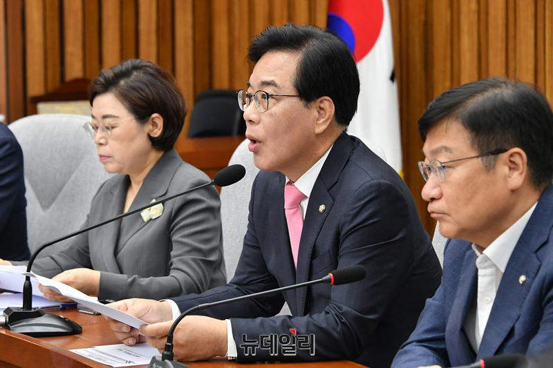 송언석 국민의힘 비상대책위원장 겸 원내대표가 29일 오전 국회에서 열린 원내대책회의에서 모두발언을 하고 있다.