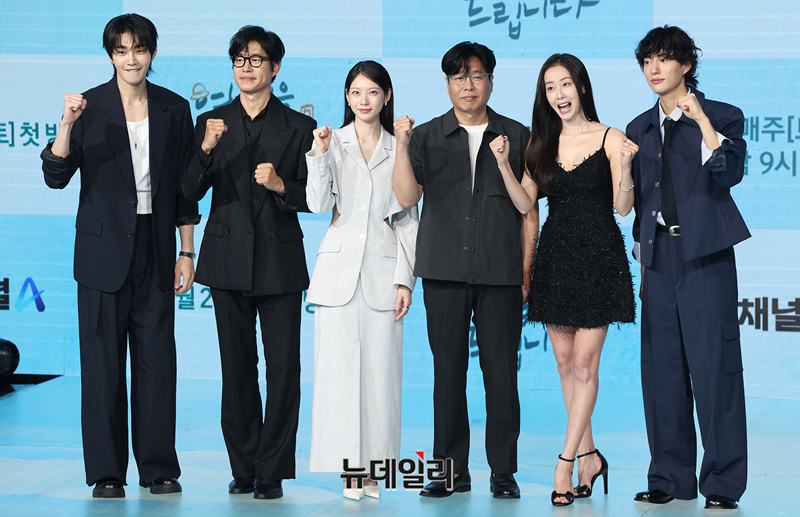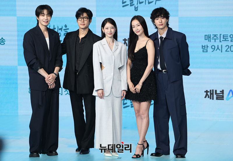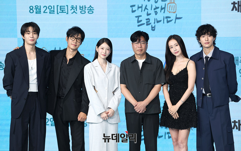 배우 김재영(왼쪽부터), 유준상, 공승연, 홍수현, 오현중이 29일 오후 서울 마포구 쇼킹케이팝센터에서 열린 채널A 새 토일드라마 ‘여행을 대신해 드립니다(연출 강솔, 극본 정회현) 제작발표회에서 포즈를 취하고 있다.'여행을 대신해 드립니다'는 한 번도 센터였던 적 없는 아이돌 출신 여행 리포터가 의뢰받은 여행들을 대신해주며 진정한 성공과 삶의 의미를 깨닫는 과정을 그린 힐링 트립 감성 드라마. 일본 베스트셀러에 올랐던 하라다 마하 작가의 동명 소설을 원작으로 했다.배우 공승연, 유준상, 김재영, 홍수현, 오현중 등이 출연한다. 8월 2일 첫 방송.
