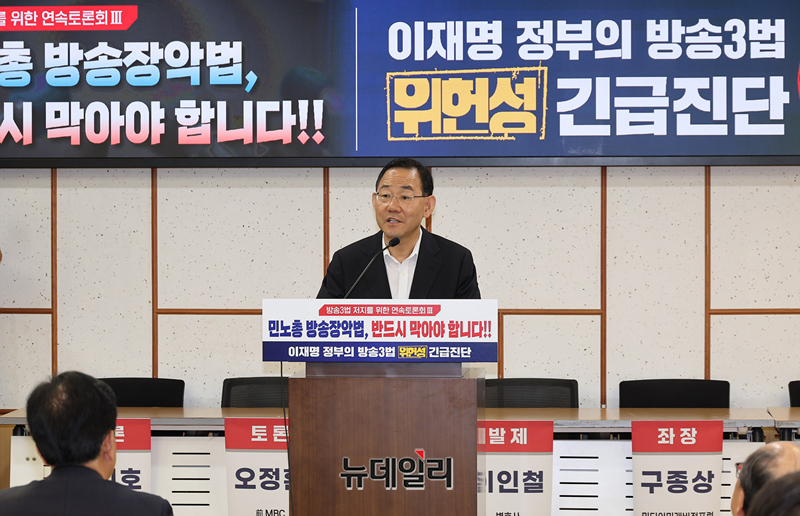 주호영 국민의힘 의원이 30일 오전 국회의원회관에서 열린 '이재명 정부의 방송3법 위헌성 긴급진단' 토론회에서 인사말을 하고 있다.국민의힘 주호영, 김기현, 배현진, 김장겸 의원과 정책위원회가 주최한 이날 토론회는 구종상 미디어미래비전포럼 상임대표가 좌장을 맡아 김태규 전 방통위 부위원장, 이인철 변호사가 각각 발제를 맡았다.이어진 토론에는 박지순 고려대 교수, 오정환 전 MBC보도본부장, 이인호 중앙대 교수, 임헌조 범시민사회단체연합 상임공동대표가 나섰다.