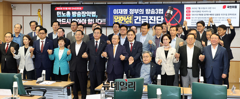 국민의힘 정책위원회와 토론회 참석자들이 30일 오전 국회의원회관에서 열린 '이재명 정부의 방송3법 위헌성 긴급진단' 토론회에 앞서 기념촬영을 하고 있다.국민의힘 주호영, 김기현, 배현진, 김장겸 의원과 정책위원회가 주최한 이날 토론회는 구종상 미디어미래비전포럼 상임대표가 좌장을 맡아 김태규 전 방통위 부위원장, 이인철 변호사가 각각 발제를 맡았다.이어진 토론에는 박지순 고려대 교수, 오정환 전 MBC보도본부장, 이인호 중앙대 교수, 임헌조 범시민사회단체연합 상임공동대표가 나섰다.