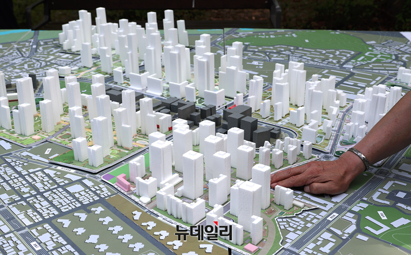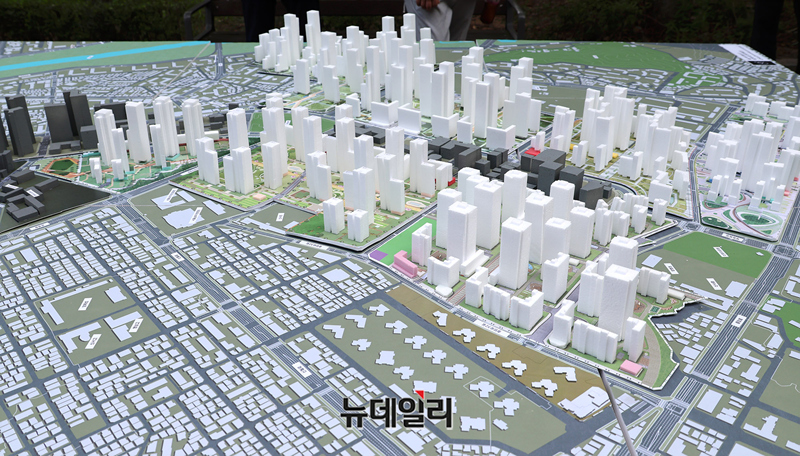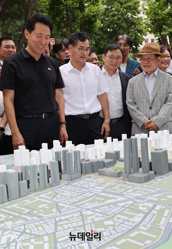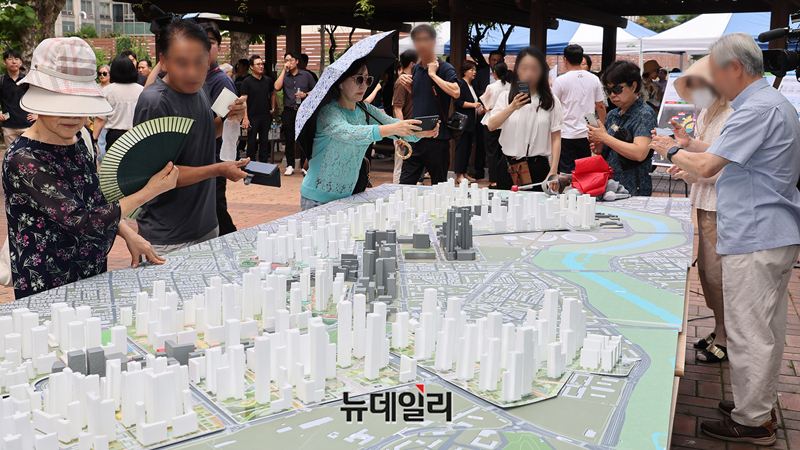 목동 주민들이 30일 오후 서울 양천구 목동6단지에서 열린 오세훈 서울시장과 재건축사업 간담회에 앞서 설치된 목동 택지개발지구 재건축사업 정비계획 모형을 살펴보고 있다.