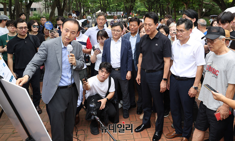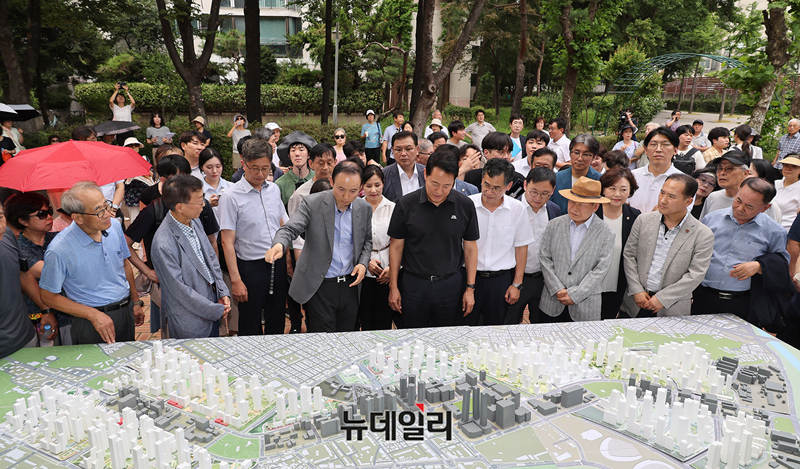 오세훈 서울시장과 이기재 양천구청장이 30일 오후 서울 양천구 목동6단지 재건축사업 현장방문을 방문해 관계자의 설명을 듣고 있다.