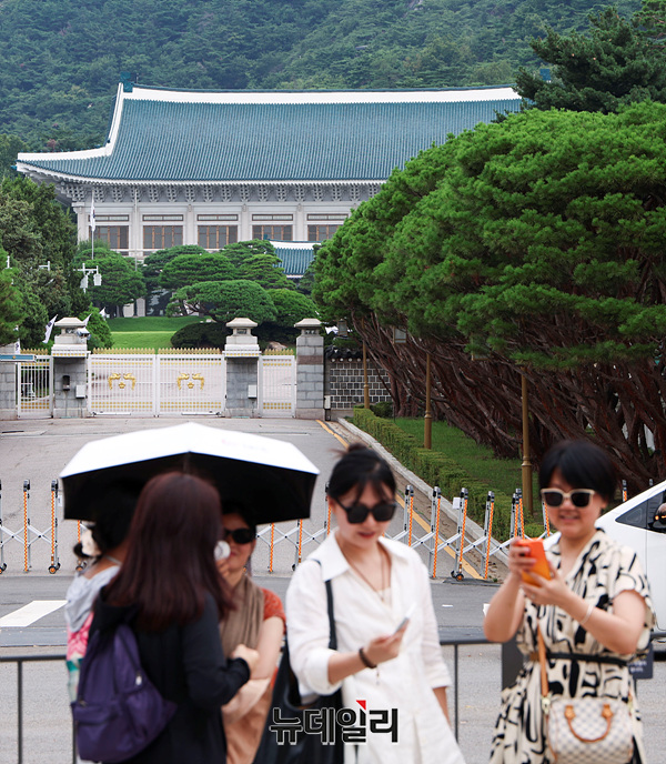 청와대 관람 일시 종료 전날인 31일 오후 관광객들이 청와대를 바라보고 있다.