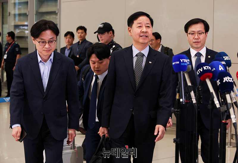 미국과 무역 협상을 마친 구윤철 부총리 겸 기획재정부 장관, 김정관 산업부 장관, 여한구 통상교섭본부장이 1일 오후 인천국제공항 제2여객터미널을 통해 귀국하고 있다. (인천=서성진 기자)