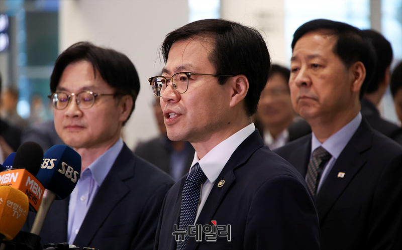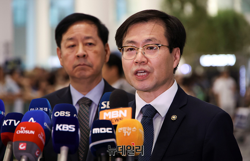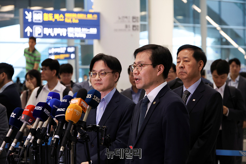 미국과 무역 협상을 마친 여한구 통상교섭본부장이 1일 오후 인천국제공항 제2여객터미널을 통해 귀국하며 취재진의 질문에 답하고 있다. (인천=서성진 기자)