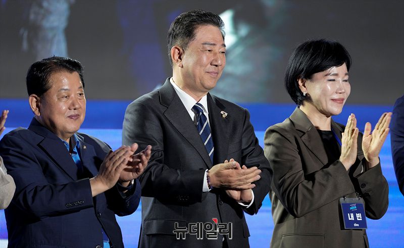 김병기 더불어민주당 당대표 직무대행 겸 원내대표를 비롯한 지도부가 2일 오후 경기 고양시 킨텍스 제2전시장에서 열린 제2차 임시전국당원대회에서 인사를 하고 있다. (경기 고양=서성진 기자)