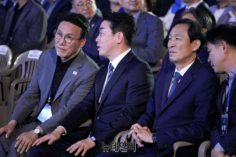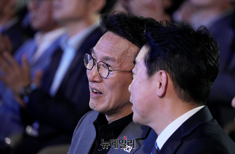김민석 국무총리와 강훈식 대통령 비서실장이 2일 오후 경기 고양시 킨텍스 제2전시장에서 열린 제2차 임시전국당원대회에서 대화를 나누고 있다. (경기 고양=서성진 기자)