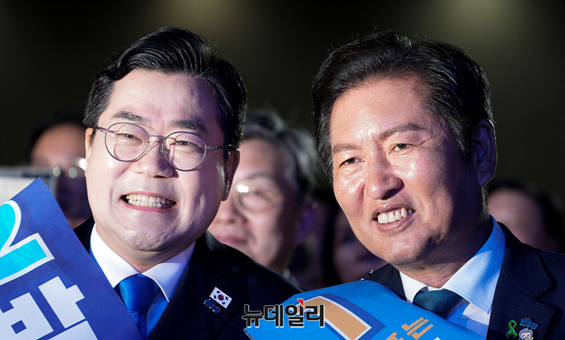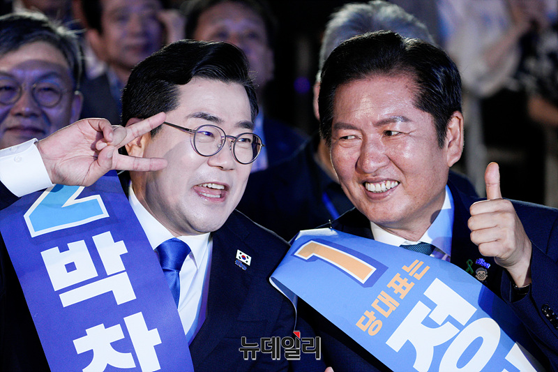 박찬대, 정청래 더불어민주당 당대표 후보가 2일 오후 경기 고양시 킨텍스 제2전시장에서 열린 제2차 임시전국당원대회에서 대화를 나누고 있다. (경기 고양=서성진 기자)