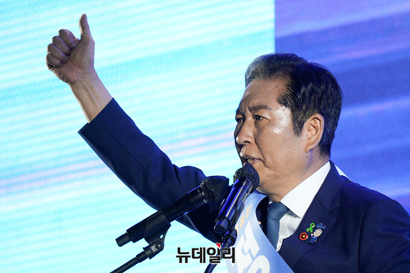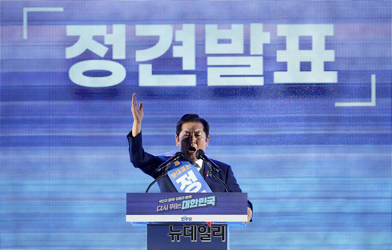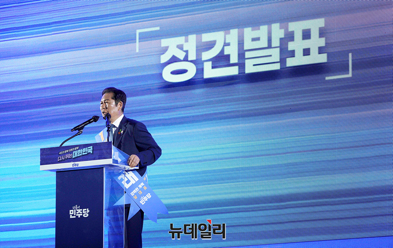 정청래 더불어민주당 당대표 후보가 2일 오후 경기 고양시 킨텍스 제2전시장에서 열린 제2차 임시전국당원대회에서 정견발표를 하고 있다. (경기 고양=서성진 기자)