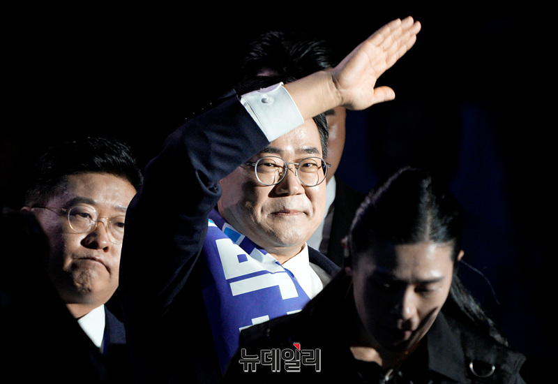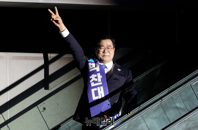 박찬대 더불어민주당 당대표 후보가 2일 오후 경기 고양시 킨텍스 제2전시장에서 열린 제2차 임시전국당원대회에 입장하며 인사를 하고 있다. (경기 고양=서성진 기자)