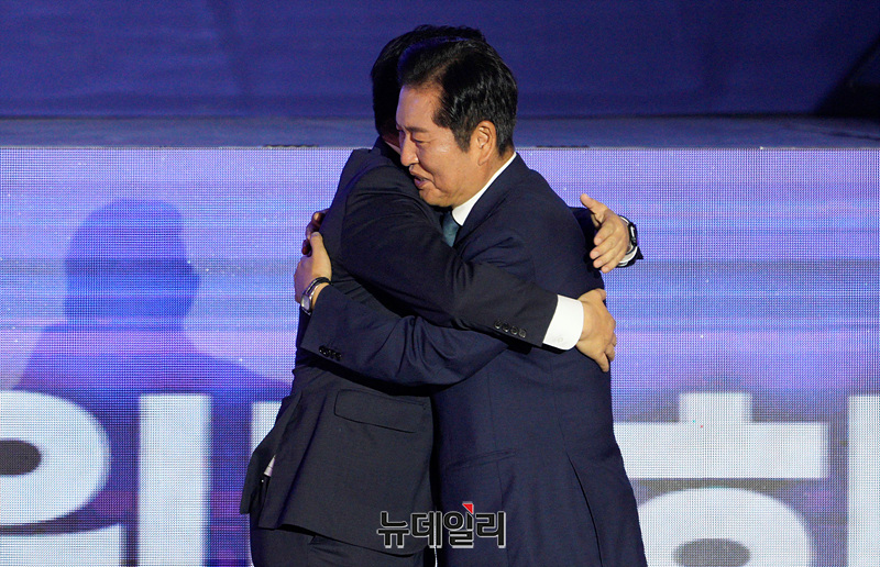 박찬대 더불어민주당 의원과 정청래 신임 당대표가 2일 오후 경기 고양시 킨텍스 제2전시장에서 열린 제2차 임시전국당원대회에서 포옹하고 있다. (경기 고양=서성진 기자)