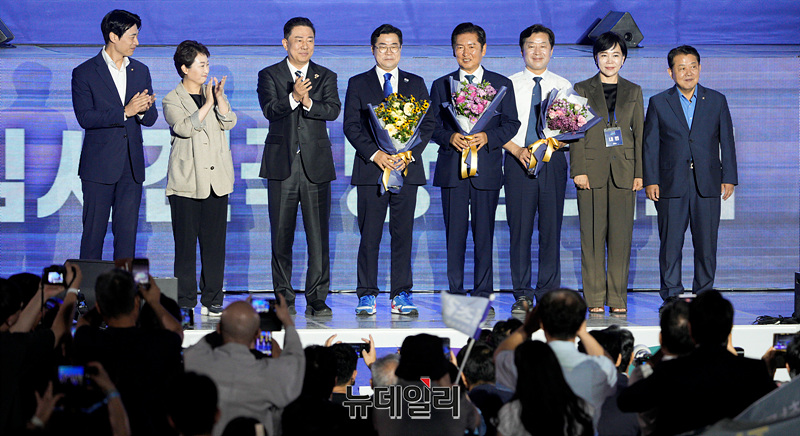 정청래 신임 더불어민주당 대표를 비롯한 지도부가 2일 오후 경기 고양시 킨텍스 제2전시장에서 열린 제2차 임시전국당원대회에서 기념촬영을 하고 있다. (경기 고양=서성진 기자)