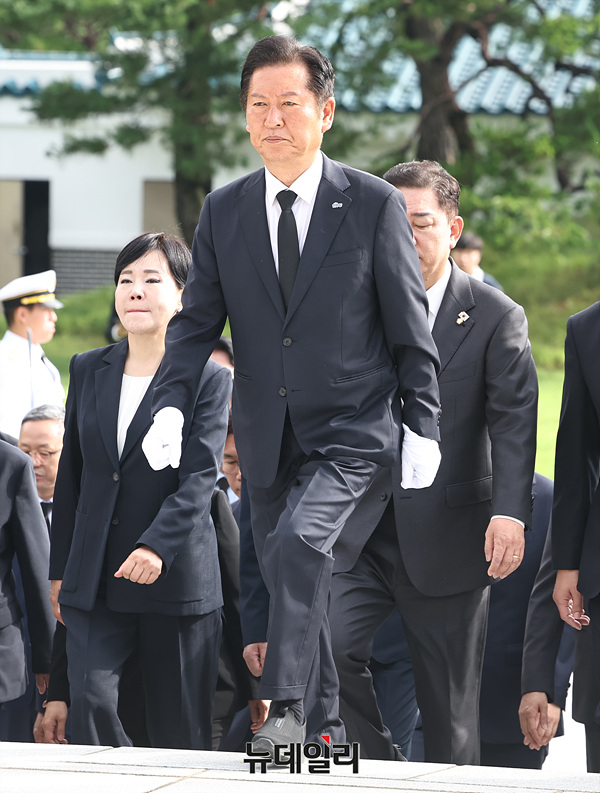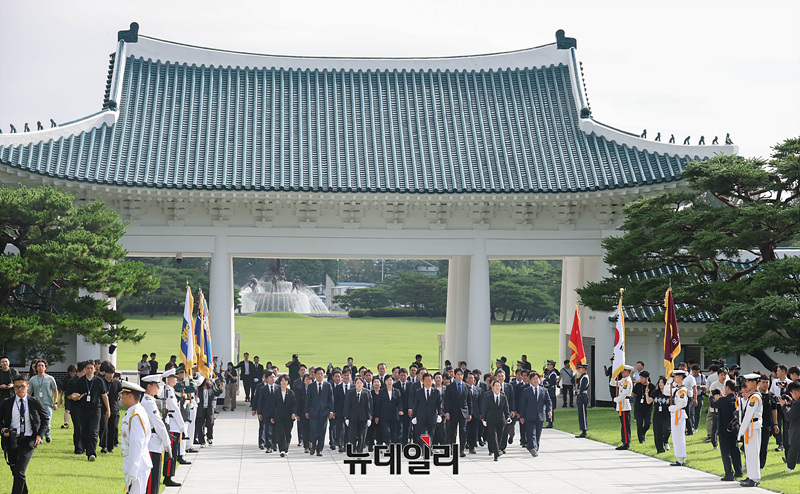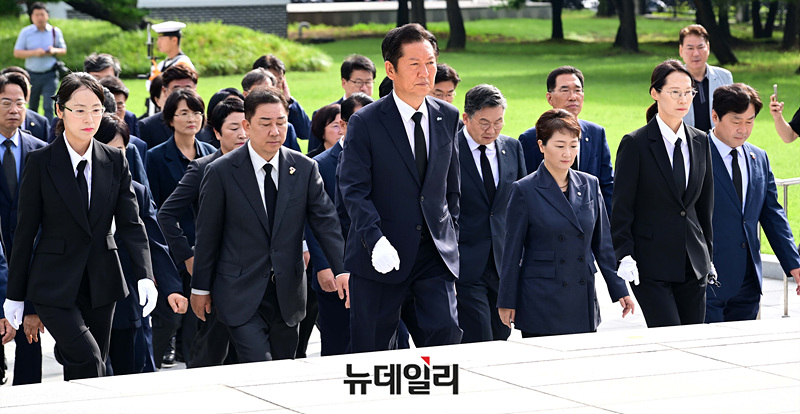 정청래 더불어민주당 신임 대표를 비롯한 지도부가 4일 오전 서울 동작구 국립서울현충원 현충탑을 향해 이동하고 있다.