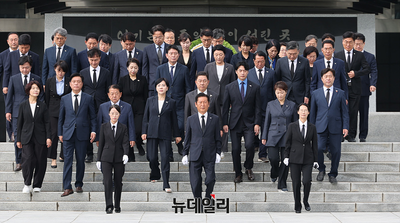 정청래 더불어민주당 신임 대표가 4일 오전 서울 동작구 국립서울현충원에서 현충탑 참배를 마치고 이동하고 있다.
