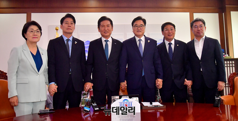 정청래 더불어민주당 대표가 5일 오전 국회에서 우원식 국회의장을 예방해 기념촬영을 하고 있다.