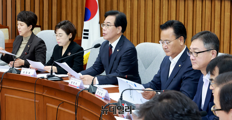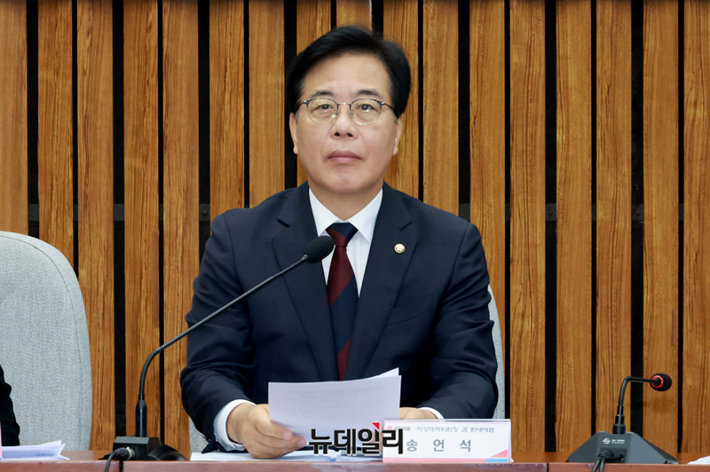 송언석 국민의힘 비상대책위원장 겸 원내대표가 5일 오전 국회에서 열린 반기업법(상법,불법파업조장법) 문제점과 향후 대응 긴급 간담회에서 발언을 하고 있다.