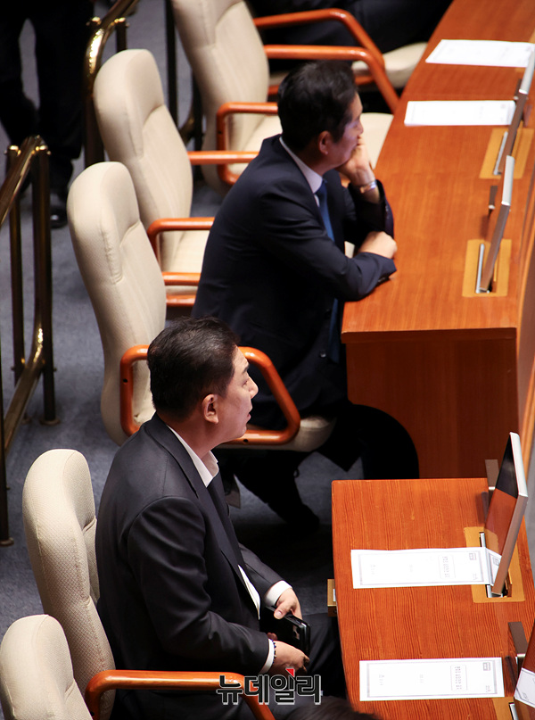 정청래 더불어민주당 대표와 김병기 원내대표가 5일 오후 국회에서 열린 본회의에 참석해 자리하고 있다.