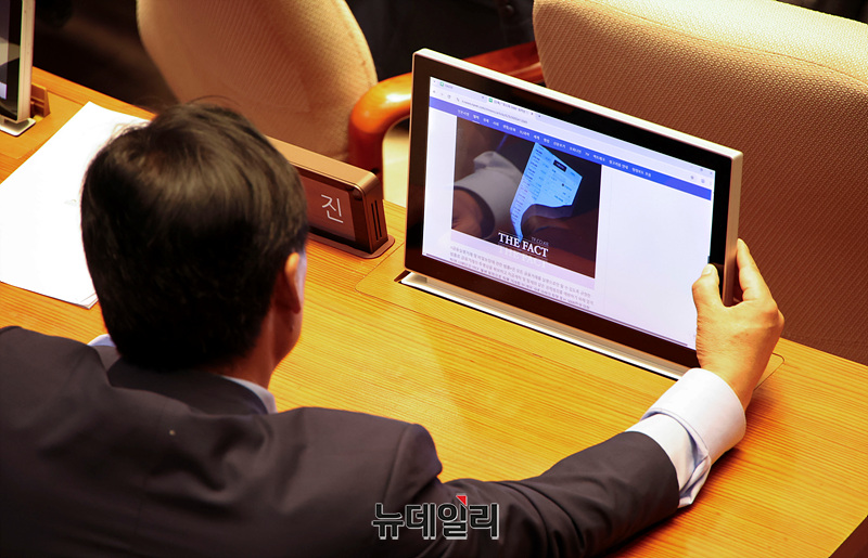 김영진 더불어민주당 의원이 5일 오후 국회에서 열린 본회의에서 이춘석 의원의 주식거래 논란 관련 기사를 읽고 있다.