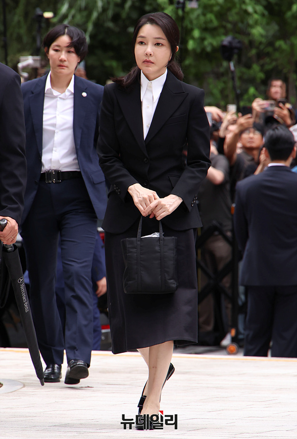윤석열 전 대통령 배우자 김건희 여사가 6일 오전 서울 종로구 KT광화문빌딩 웨스트에 마련된 민중기 특별검사팀 사무실에 피의자 신분으로 출석하고 있다.