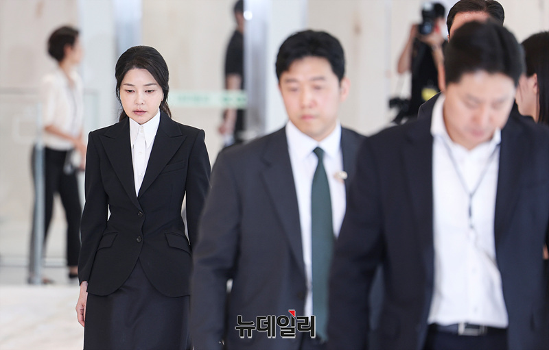윤석열 전 대통령 배우자 김건희 여사가 6일 오전 서울 종로구 KT광화문빌딩 웨스트에 마련된 민중기 특별검사팀 사무실에 피의자 신분으로 출석하고 있다. (사진=공동취재단)
