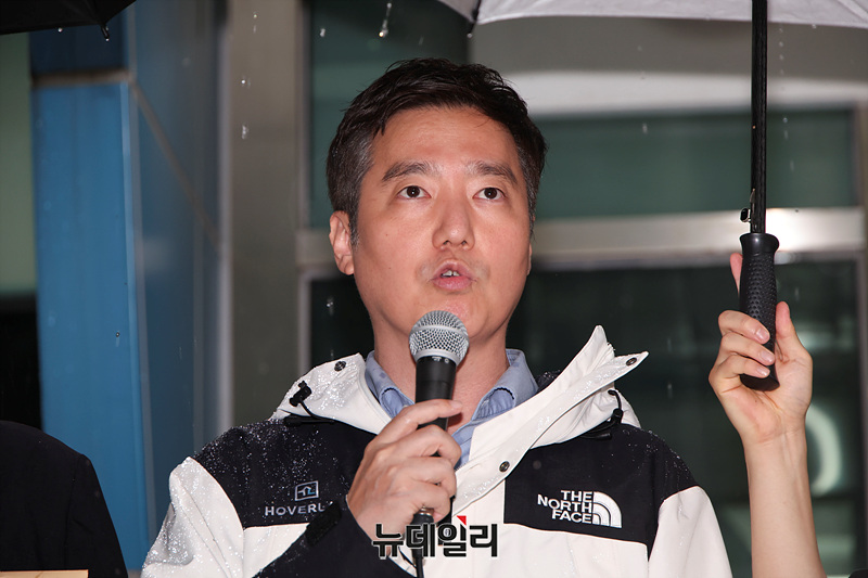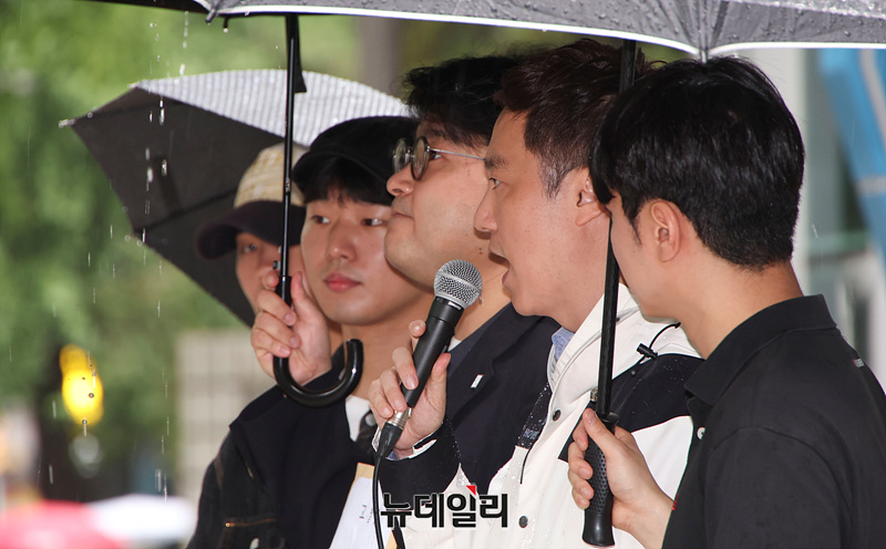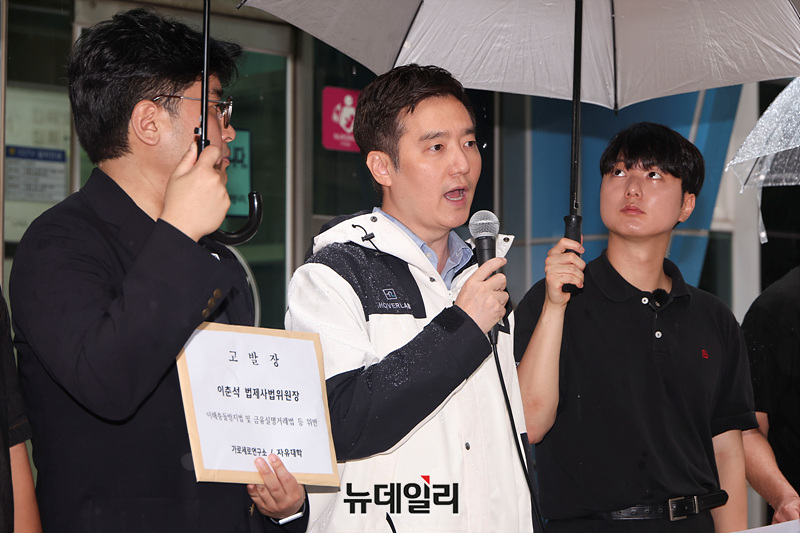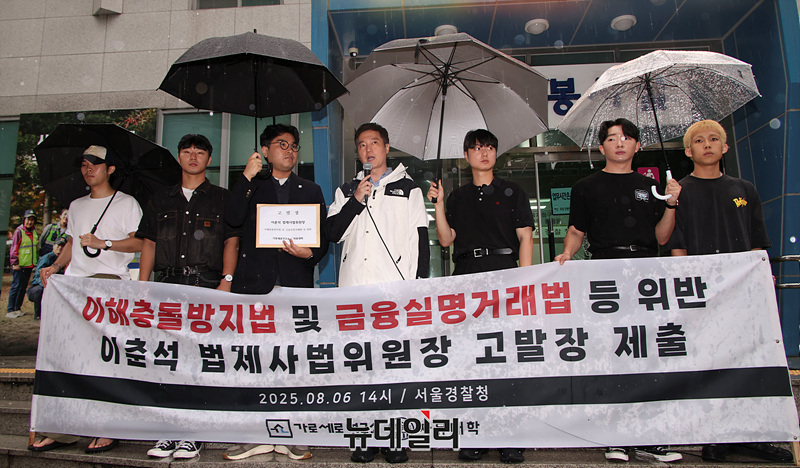 김세의 가로세로연구소 대표가 6일 오후 서울 종로구 서울경찰청 앞에서 '이해충돌방지법 및 금융실명거래법 등 위반 이춘석 법제사법위원장 고발장 제출' 기자회견을 열고 발언하고 있다.