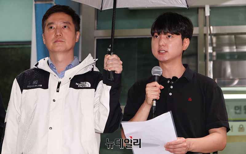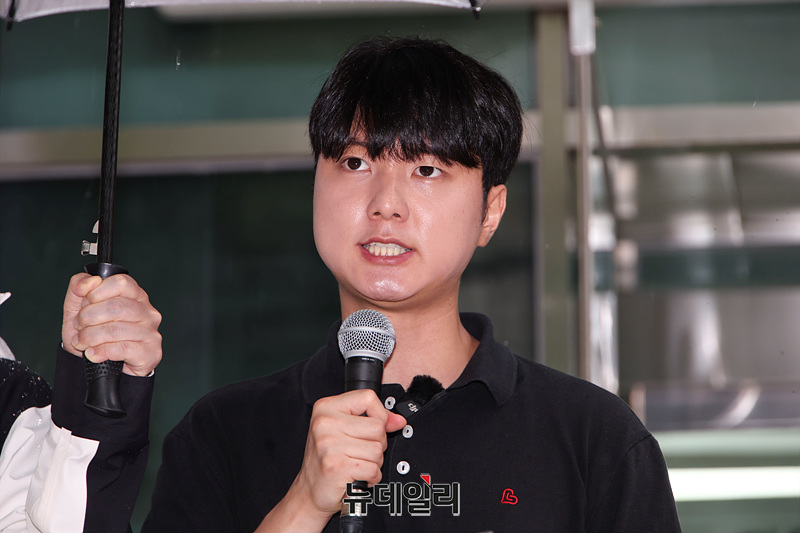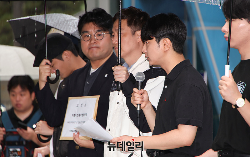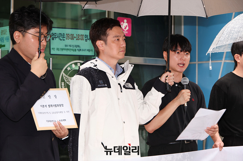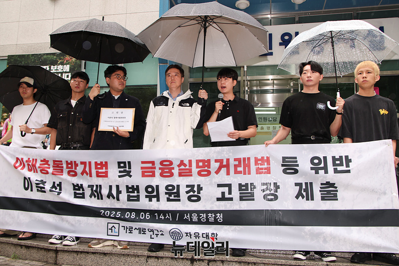 박준영 자유대학 대표가 6일 오후 서울 종로구 서울경찰청 앞에서 '이해충돌방지법 및 금융실명거래법 등 위반 이춘석 법제사법위원장 고발장 제출' 기자회견을 열고 발언하고 있다.