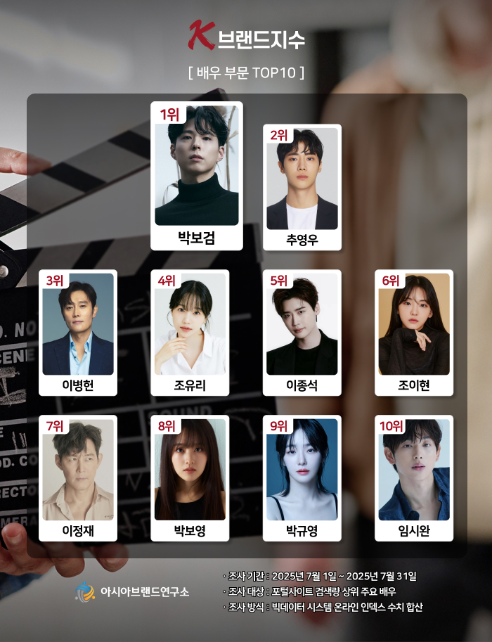 이번 K-브랜드지수 배우 부문은 포털 사이트 검색량 상위 주요 배우를 대상으로 지난달 1일부터 31일까지의 온라인 빅데이터 2억4380만9460건을 분석해 진행됐다.