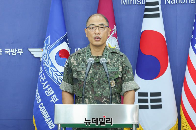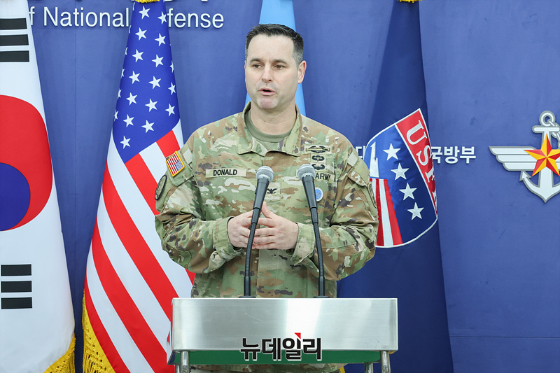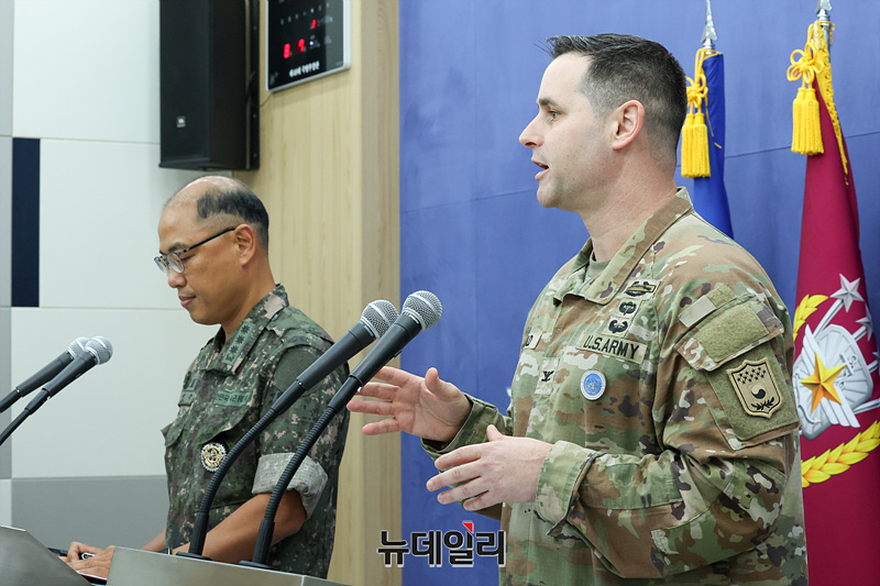 이성준 합동참모본부 공보실장(왼쪽)과 라이언 도널드 유엔사·연합사·주한미군사 공보실장이 7일 오전 서울 용산구 국방부 브리핑룸에서 25년 을지 자유의 방패(UFS) 연습 한미 공동브리핑을 하고 있다. (사진=공동취재단)